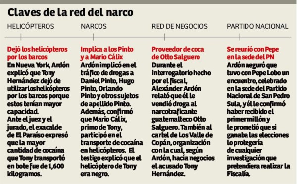 Otros mencionados: El exalcalde hondureño Alexánder Ardón ante el juez y el jurado expresó que Tony Hernández, además de hacer negocios con el mexicano el Chapo Guzmán, en Honduras operaba con los narcotraficantes Mario Cálix, Daniel Pinto, Orlando Pinto y Hugo Pinto. Según él, por orden de Tony, Juan Carlos Bonilla mató a otro narco.