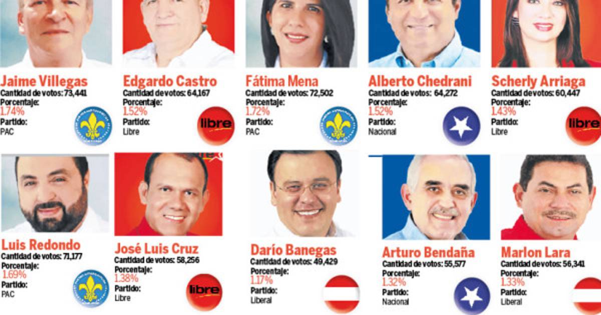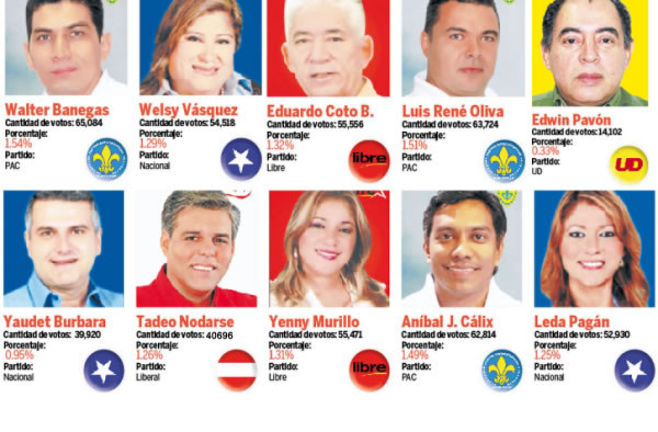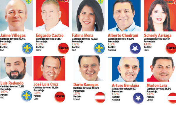 Según las proyecciones que manejaban los mismos candidatos, hasta ayer a las 4:00 pm que se había escrutado más del 60% de las actas y considerando el proceso de selección que contempla la ley electoral, los 20 diputados los integraban seis representantes del Partido Anticorrupción (PAC), cinco del partido Libertad y Refundación (Libre), cinco del Partido Nacional, tres del Liberal y uno de la UD. Los partidos Faper, DC, Alianza Patriótica y Pinu no obtuvieron suficientes votos para obtener representantes en el Legislativo, según proyecciones.