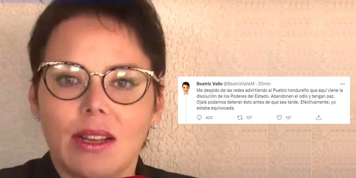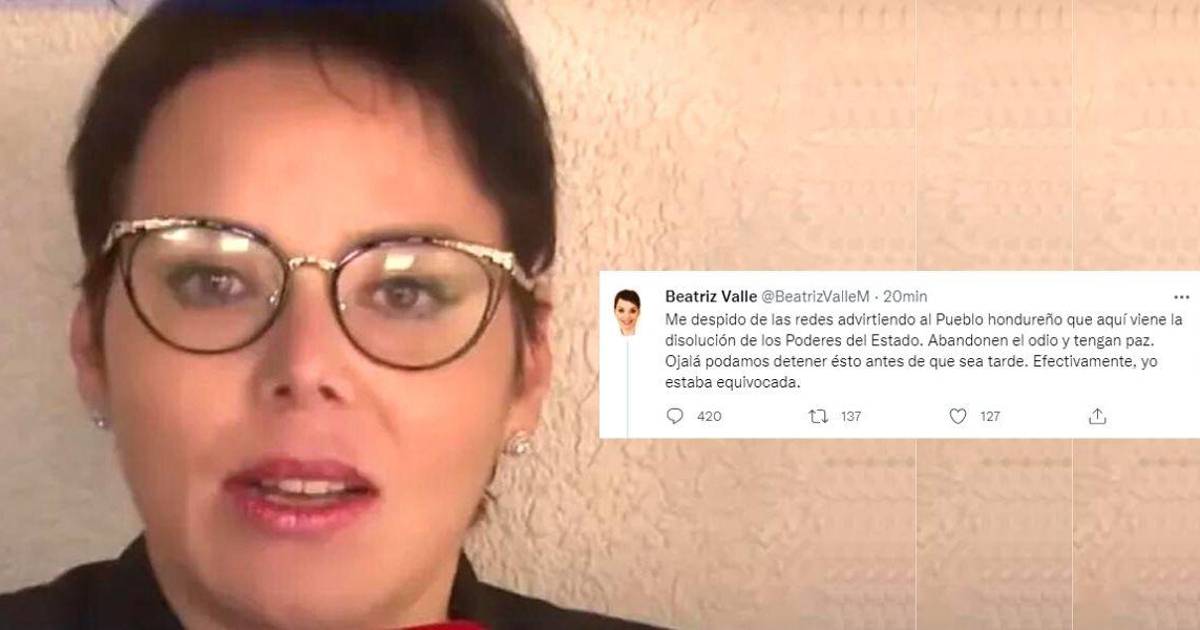 “Me despido de las redes advirtiendo al Pueblo hondureño que aquí viene la disolución de los Poderes del Estado. Abandonen el odio y tengan paz. Ojalá podamos detener ésto antes de que sea tarde. Efectivamente, yo estaba equivocada”, comenzó escribiendo Valle en un tuit este domingo sobre las 3:30 p.m.