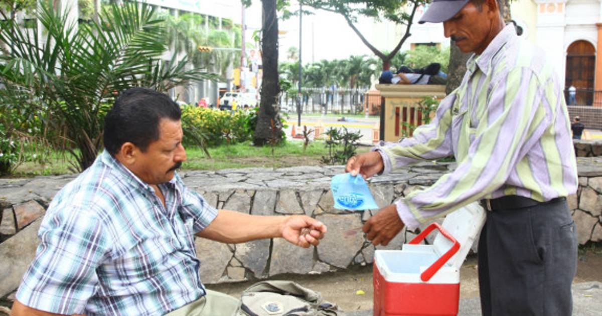 Camina más de 12 horas diarias sin parar, cargando una pequeña hielera donde guarda las bolsas de agua que vende en el parque central y calles aledañas.