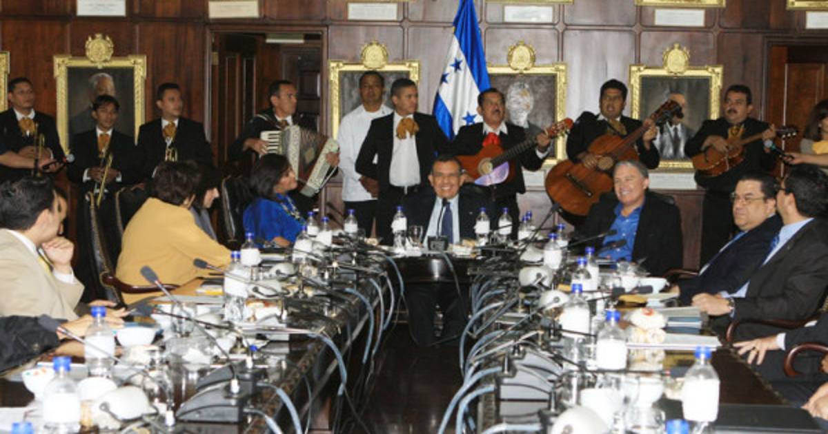 En la última sesión del año del Consejo de Ministros, un grupo de mariachis cantó Las Golodrinas al presidente Porfirio Lobo y su gabinete.