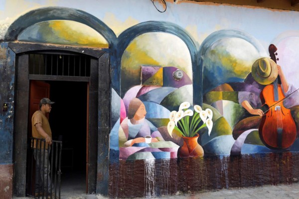 Un hombre que sale de su casa en el poblado de San Juan de Flores, Cantarranas, donde las fachadas de las casa han sido pintadas con murales de reconocidos artistas nacionales e internacionales. EFE