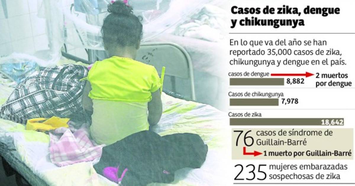 En los que va del año, la Secretaría de Salud reporta 35,500 casos de estas tres enfermedades que son transmitidas por el zancudo Aedes aegypti. El zika lleva 18,642, el doble del dengue con 8,882 casos. “Ahora que vienen las lluvias hay que recordarle a la población que tenemos que destruir los criaderos de zancudos porque se puede incrementar el número de pacientes en la época lluviosa”.