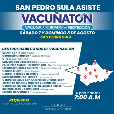 Este sábado 7 y domingo 8 de agosto se realizará la segunda vacunatón. En San Pedro Sula ya están definidos los lugares.