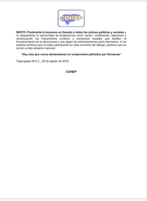 'Como sector privado organizado estamos convencidos que la búsqueda de consensos y acuerdos políticos, sociales y económicos son fundamentales pora el desarollo ecónomino, la seguridad jurídica y el fortalecimiento del Estado de Derecho. La Paz social está condicionada a la participación sincera de los actores políticos en el proceso del Diálogo Político Nacional, comprometidos en la búsqueda del bien común para los hondureños'.