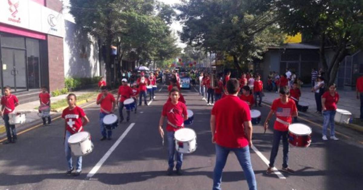 Una banda de guerra desfila por una calle de San Pedro Sula.