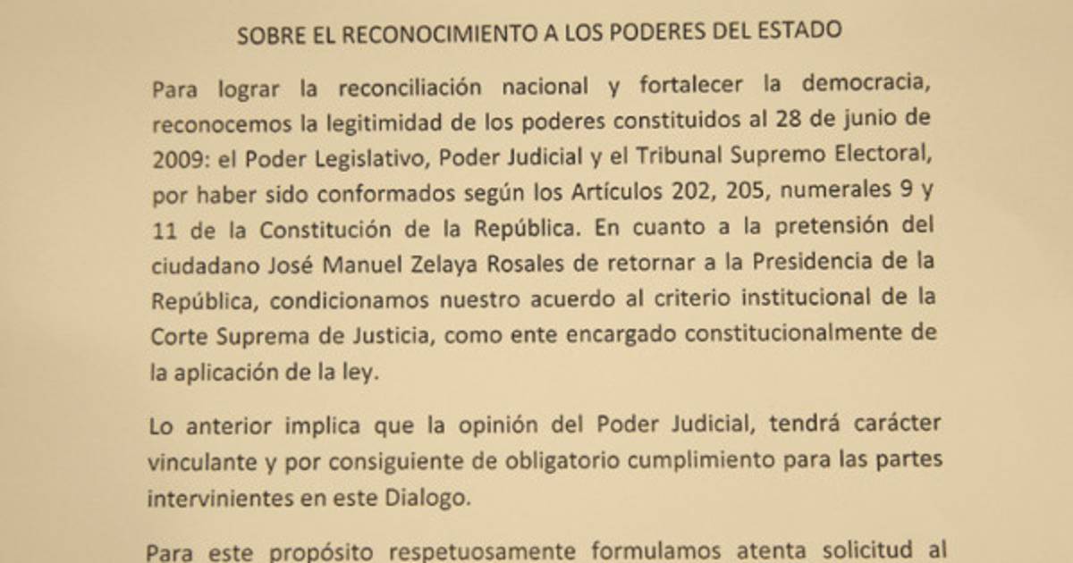“Respetuosamente solicitamos al Congreso Nacional que previo dictamen de las instancias pertinentes, si lo estima necesario, emita la decisión correspondiente a ese punto, que textualmente dice: para lograr la reconciliación y fortalecer la democracia, solicitamos al Congreso Nacional que a efectos de recuperar la integración y legitima conformación de los poderes constituidos al 28 de junio de 2009, en lo procedente retrotraiga la situación del Poder Ejecutivo, el Poder Legislativo, el Poder Judicial y el Tribunal Supremo Electoral a su estado previo al 28 de junio, por haber sido conformados según los artículos 202, 205 incisos 9 y 11 y 236 de la Constitución de la República de Honduras.