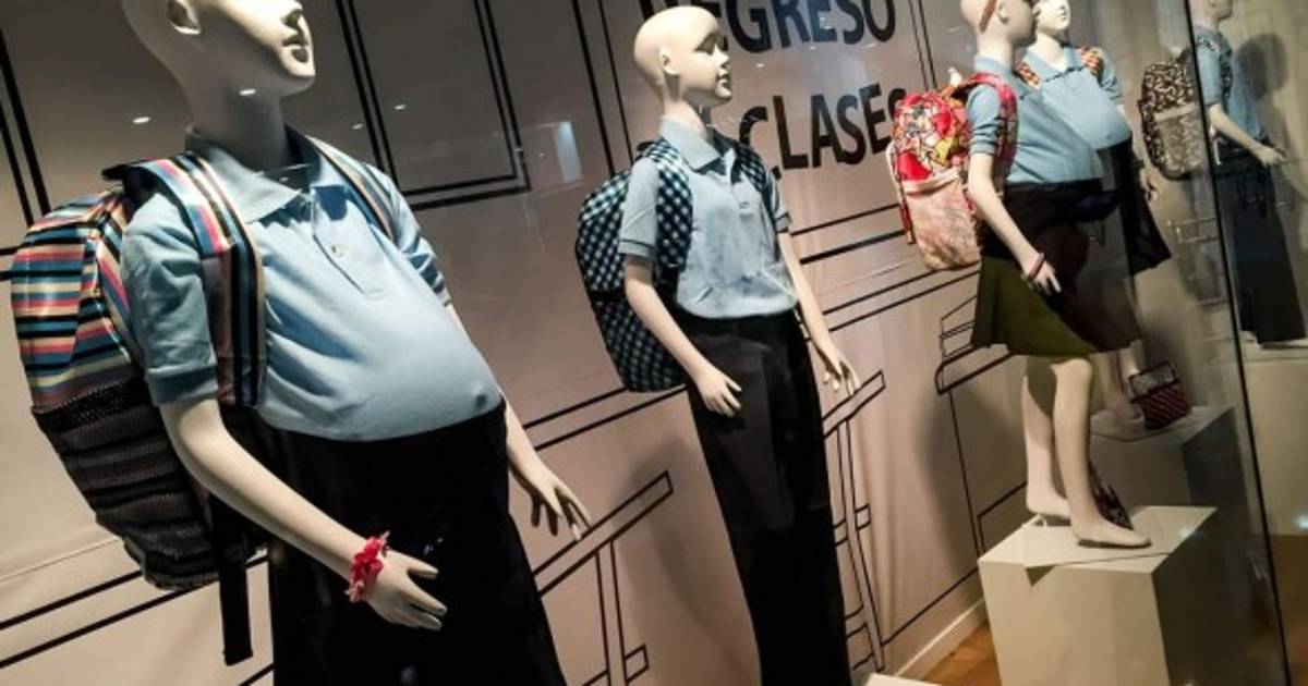 Dos niños y tres niñas en avanzado estado de gestación comparten el escaparate donde el fondo simula un aula con sus pupitres y su pizarra y que atrapa aún más la atención de los transeúntes mediante la camisa azul de los cinco maniquíes, color que identifica a los alumnos de 12 a 15 años que van a la escuela en el país.