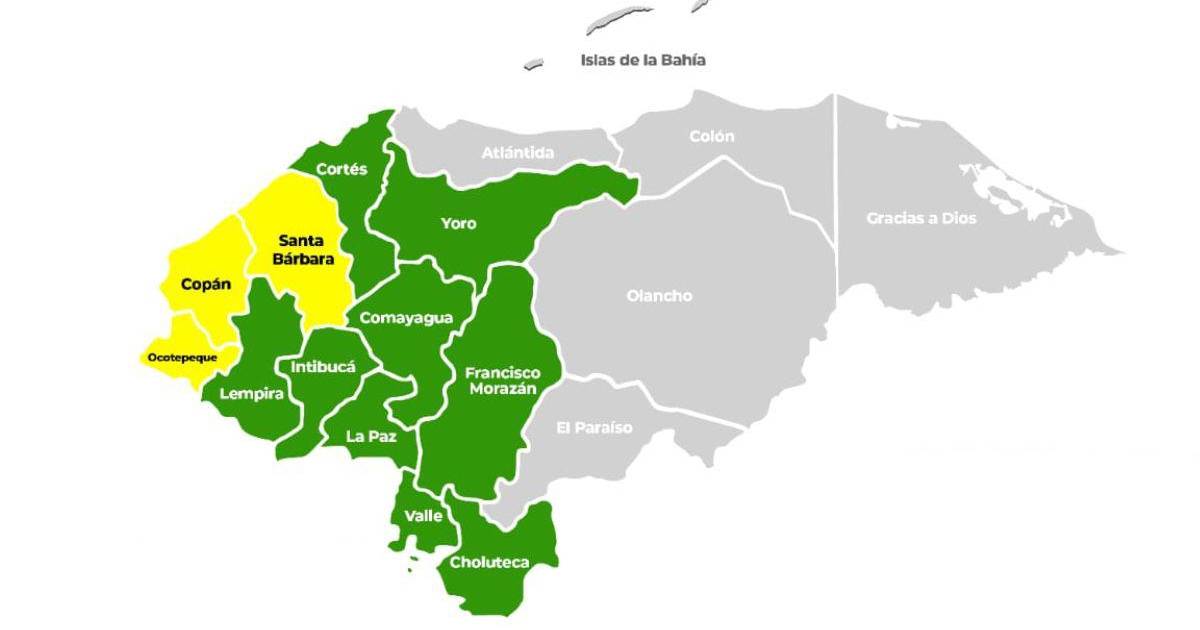 Mientras que continúan en alerta verde los departamentos de Intibucá, Lempira, La Paz, Yoro, Cortés, Comayagua, Francisco Morazán, Choluteca y Valle.