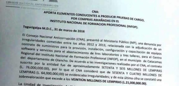 La investigación se hizo sobre un contrato valorado en 76 millones de lempiras con el supuesto objetivo de acondicionar el centro regional del Infop en Catacamas, Olancho; era dinero destinado para la compra de equipo de tecnología, mecatrónica, mecánica, entre otros.