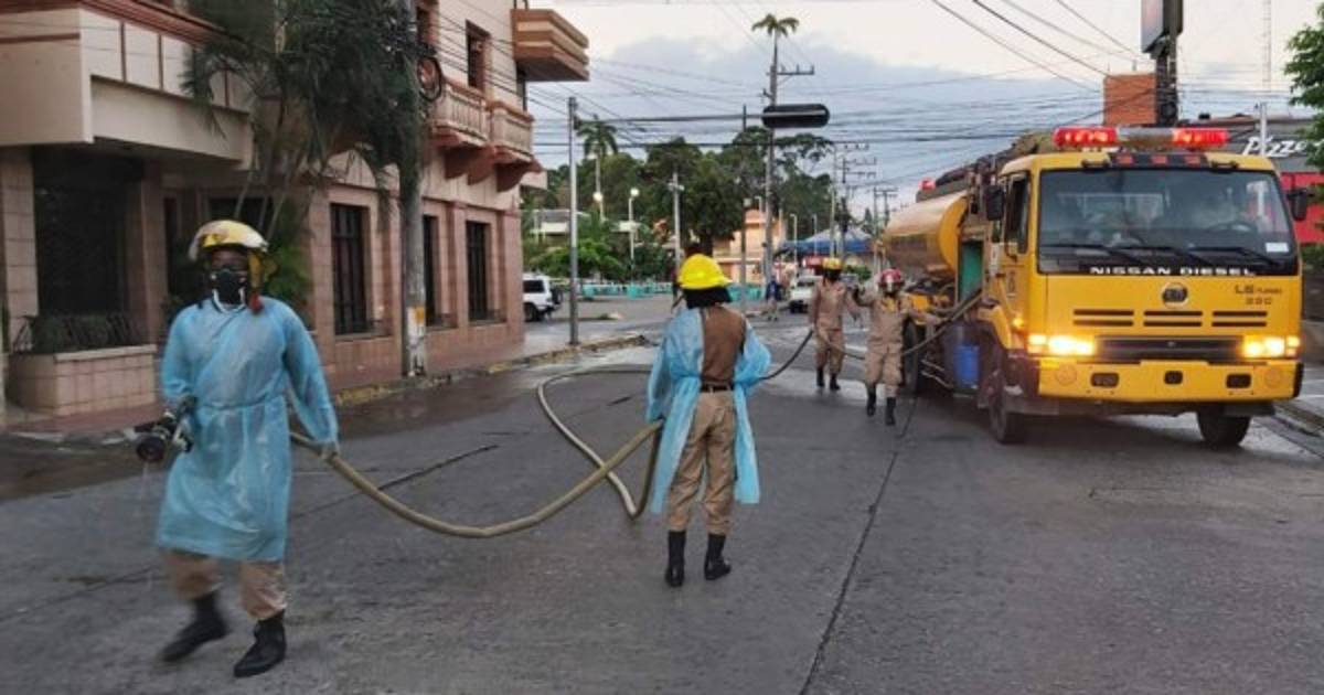 Miembros del Cuerpo de Bomberos de La Ceiba madrugaron esta jueves a desinfectar las aceras del centro de la ciudad para que las personas de la tercera edad que serán atendidas en los bancos este día no corran el riesgo de contagio de Covid-19.