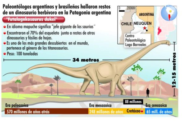 Primer ejemplar de una rama hasta ahora desconocida de titanosaurios, bautizada como Lognkosauria, este dinosaurio fue denominado 'Futalognkosaurus dukei'. Su nombre proviene de una palabra de los indios mapuches que significa 'jefe gigante de los saurios' y 'dukei' alude a la empresa privada Duke Energy Argentina, que financió la mayor parte de los trabajos en las orillas del lago artificial Barreales, a 90 km de la ciudad patagónica argentina de Neuquén.