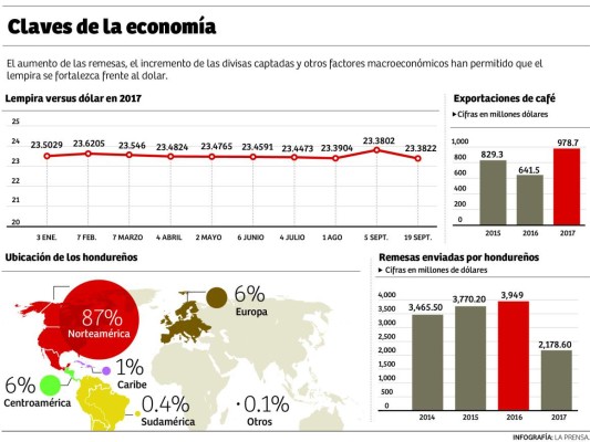 “Tenemos una revaluación del lempira pequeña. Si comparamos con el 31 de diciembre de 2016, hemos visto una revaluación de 0.52%. Eso significa 12 centavos”, dijo Bautista. “Al principio hablábamos de una devaluación de 5%, ahora tenemos una revaluación. Ahora todo dependerá de las condiciones del mercado”.