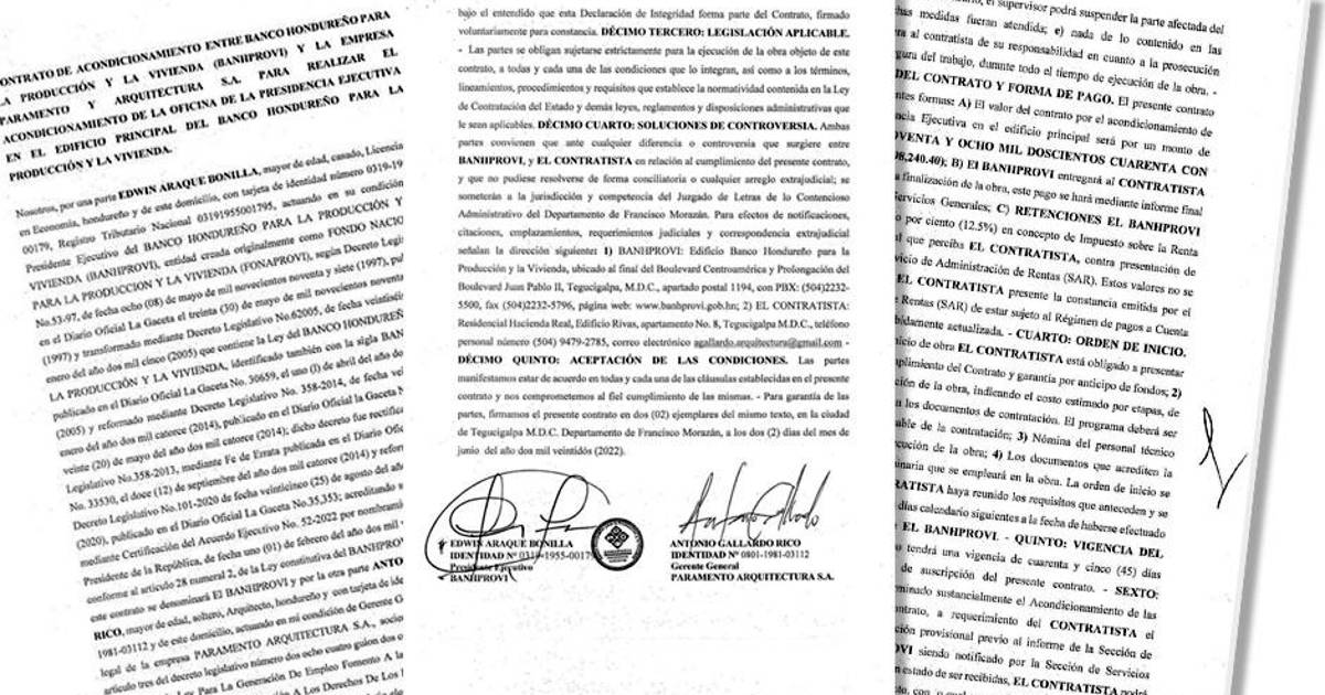 “El valor del contrato por el acondicionamiento de la oficina de la Presidencia Ejecutiva en el edificio principal será de 498,240 lempiras; Banhprovi entregará al contratista un solo pago de acuerdo a la finalización de la obra”, señala el documento firmado por Araque y por el representante legal de la empresa Paramento Arquitectura, Antonio Gallardo.