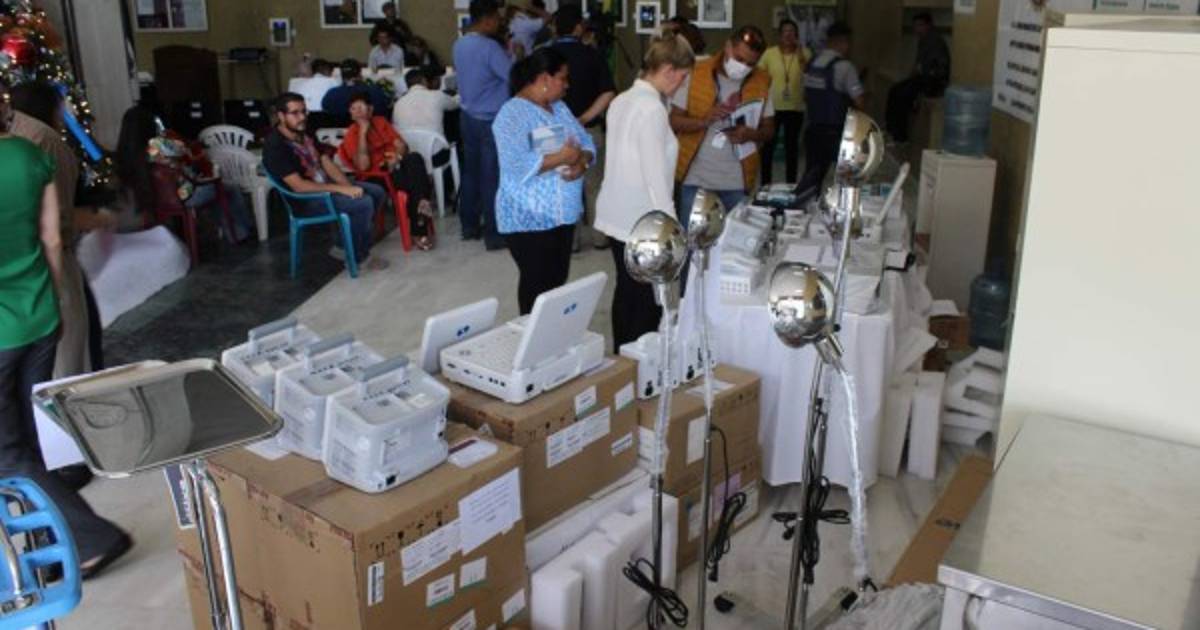 Las autoridades de ese centro recibieron tres electrocauterios, cinco electrocardiogramas, cinco electrocardiógrafos, dos desfibriladores pediátricos, dos desfibriladores para adultos, 100 equipos de inserción de equipo intrauterino (DIU), 30 equipos de parto, 15 doppler fetales, 50 bombas de infusión, tres lámparas cielíticas, una incubadora de transporte, lámparas de fototerapia y de calor, 28 carros de expedientes, 300 portaexpedientes, 28 gabinetes para medicamentos, 120 sillas para sala de espera y emergencia, 100 lámparas de cuello de ganso, 50 colchones de agua y 50 colchones estándar, 15 estantes de acero inoxidables y 100 yardas de tela verde.