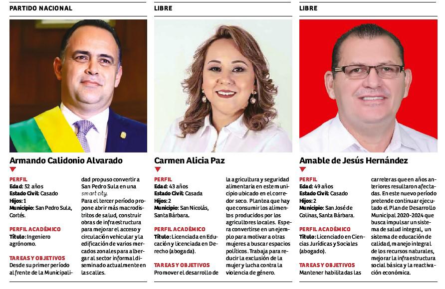 Además de estos aspirantes, Leopoldo Eugenio Crivelli (con el PL en Choloma) y Amable de Jesús Hernández (con Libre en Colinas, Santa Bárbara) esperan quedarse una vez más en el poder.