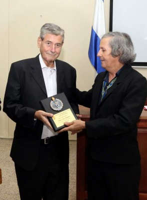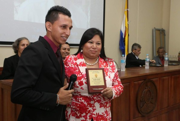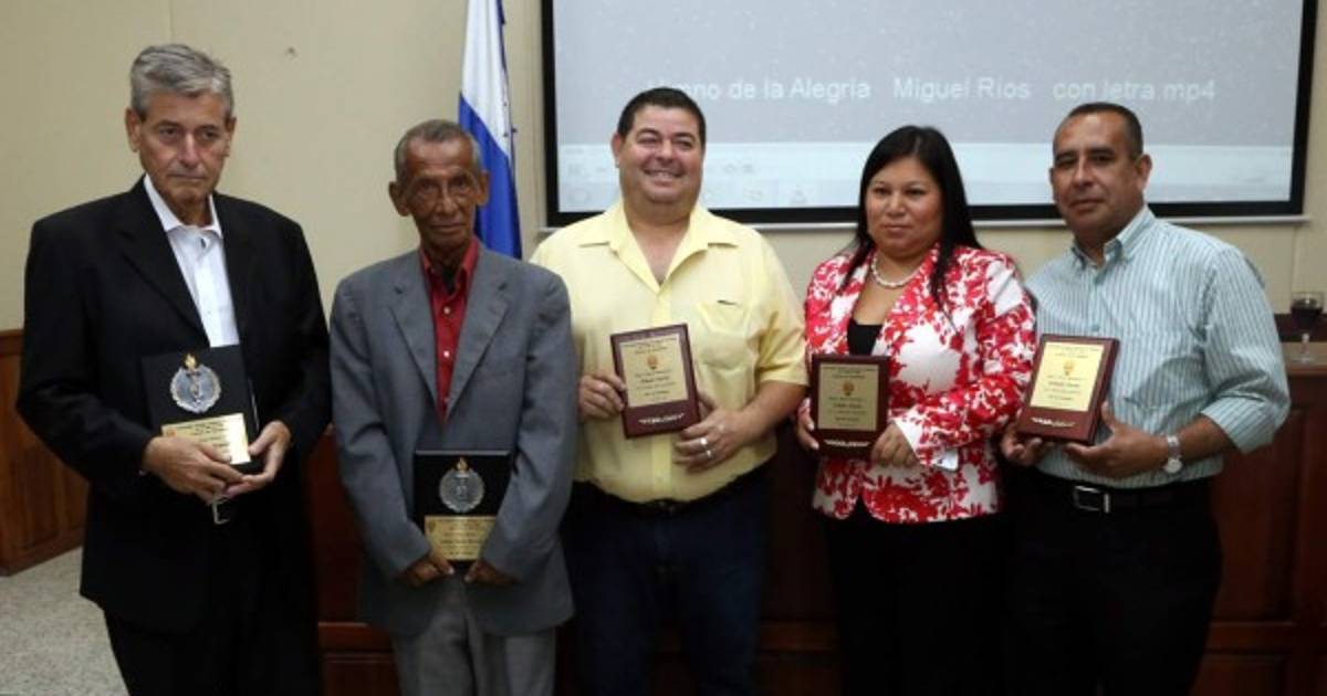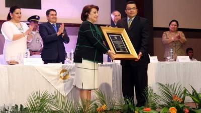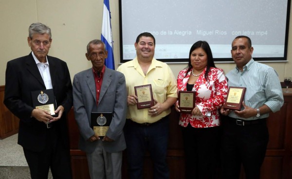 En la gráfica superior Wilmer Pérez Regalado, Carlos Mario Herrera, Nelson García, jefe de redacción de LA PRENSA; Lisseth García, vicepresidenta del CPH, y Orlando Escoto, jefe de redacción de La Tribuna, con las placas que les fueron entregadas por su trayectoria y labor periodística. Foto: Amílcar Izaguirre