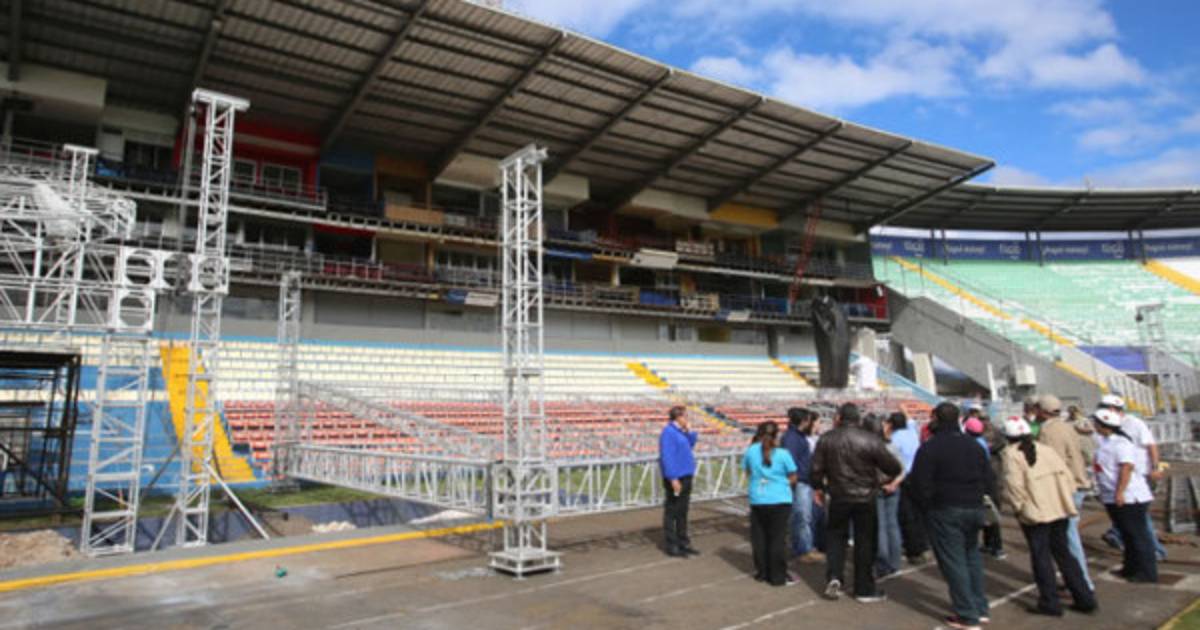 'Los técnicos encargados realizaron las pruebas de sonido y pantallas que emitirán los mensajes desde el estrado principal. A su vez, ya se colocaron techos y toldos, con el fin de que este viernes por la tarde quede todo concluido, ya que esa es la fecha límite en el cronograma de trabajo', añadió.