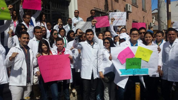 Estudiantes del séptimo año de la Facultad de Medicina de la Universidad Nacional Autónoma de Honduras (Unah) que buscan realizar el servicio médico social realizaron un plantón este miércoles en Tegucigalpa, capital de Honduras, frente a la Secretaría de Salud.