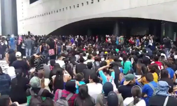 Los estudiantes que llegaron a clases en el edificio de Derecho esperan en la acera la asamblea informativa.