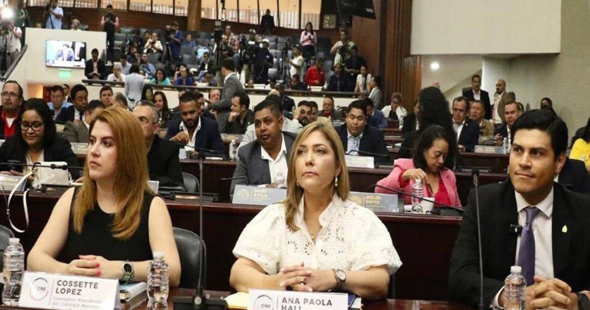 Cossette López, Ana Paola Hall y Marlon Ochoa, consejeros del Consejo Nacional Electoral (CNE), ingresaron este martes al hemiciclo legislativo entre aplausos de la oposición y abucheos del oficialismo para comparecer ante el pleno del Congreso Nacional.