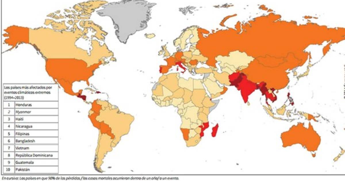 Honduras, Myanmar y Haití rankearon más alto en los últimos 20 años, como muestra el mapa. En Myanmar y Honduras, la mayor parte de la destrucción relacionada con el clima y las muertes fue consecuencia de eventos particulares. En Myanmar, por ejemplo, el ciclón Nargis en 2008 causó un 95% más que el total los daños computados en los últimos 20 años, mientras que el 80% de todos los daños y muertes en Honduras fueron causados por el huracán Mitch en 1998. Otros países, como Filipinas (que ocupa el quinto) se han visto afectados de forma más continua.
