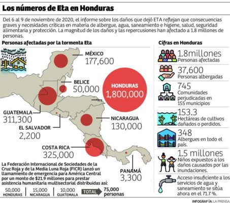 Las organizaciones humanitarias en Honduras siguen identificando y reasignando fondos existentes para respaldar la respuesta en la emergencia. Son 19 organizaciones identificadas las que están trabajando en 15 departamentos, pero hay muchas necesidades; de 37,600 personas en albergues, el 80% se ubican en el departamento de Cortés. Solo en Villanueva se reportan que hay 10,000 personas en 42 albergues.Se trabaja en realizar pruebas diagnósticas de covid-19 en los albergues, además de implementar programas para promover la salud.