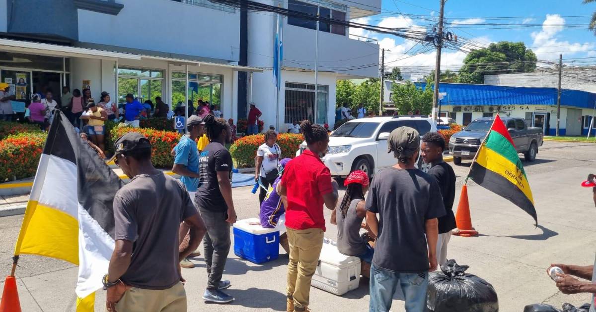 Habitantes y pescadores de la etnia garífuna de la aldea Nueva Armenia, municipio de Jutiapa, Atlántida, protestaron este martes frente a las instalaciones del Ministerio Publico de La Ceiba.