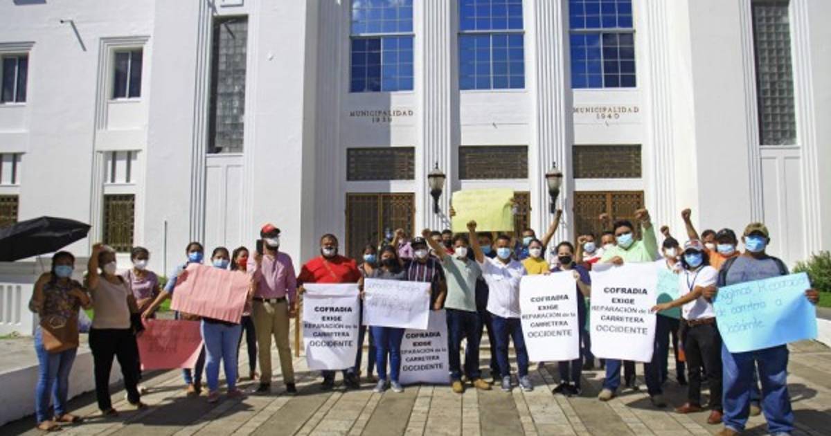 Con pancartas y carteles en mano llegaron a protestar ayer frente a la municipalidad un grupo de pobladores de Cofradía para exigir a las autoridades la reparación de la carretera que va hacia a occidente y que también conduce a ese sector.