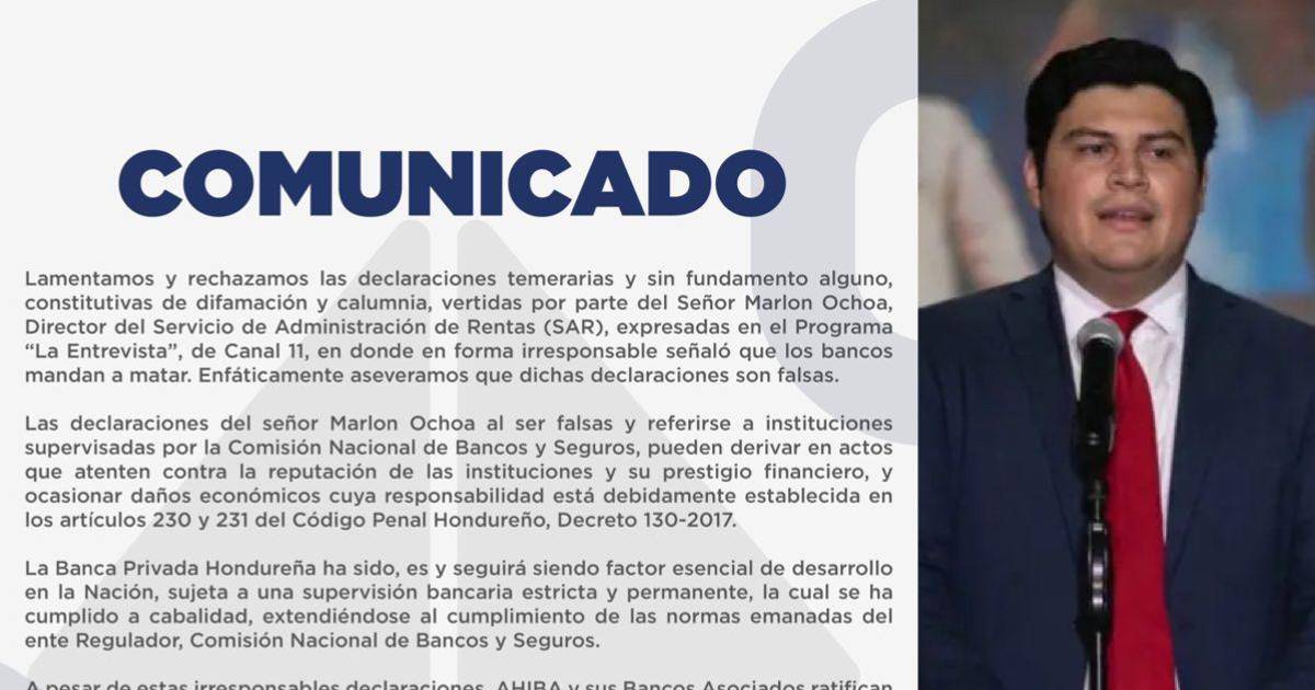 La Asociación Hondureña de Instituciones Bancarias (Ahiba) rechazó ayer lunes las acusaciones del titular del Sistema de Administración de Rentas (SAR), Marlon Ochoa, diciendo que la banca ha incurrido en el asesinato de personas para avanzar en sus intereses económicos.