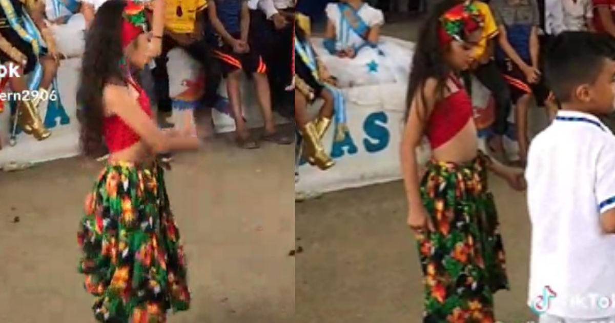 La menor de unos seis años anda una falda verde floreada y mueve sud cadera con tremenda destreza.