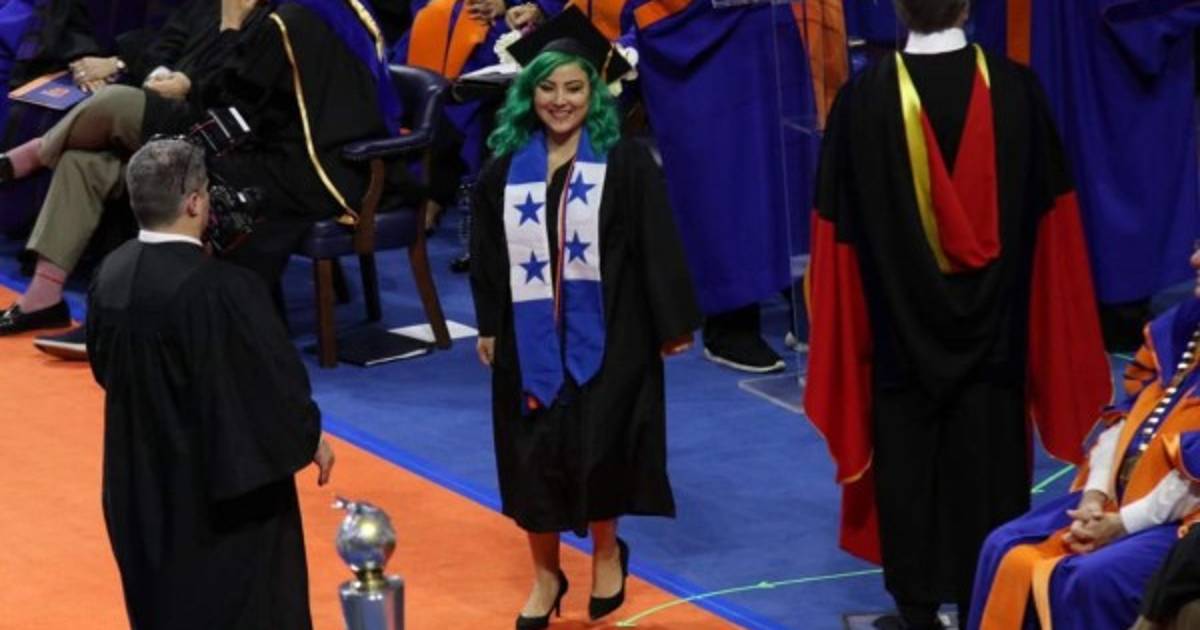 Enormemente orgullosa de sus raíces hondureñas, Jessica Trochez (22) causó sensación al recibir su título de Licenciada en Psicología en UF University Florida, llevando sobre sus hombros los colores de la bandera de Honduras.