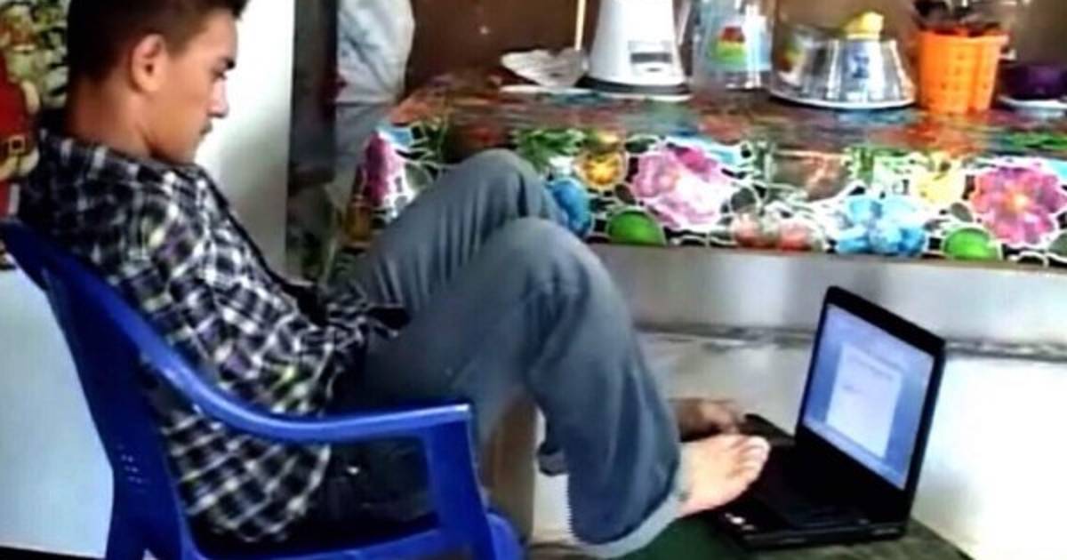Fernando Recinos nació sin brazos, lo que no ha sido un impedimento para poder estudiar y utilizar su computadora.