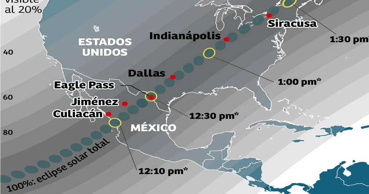 La franja de la totalidad del eclipse cruzará por el norte de México, Estados Unidos y el sureste de Canadá, allí se observará el oscurecimiento del Sol en su totalidad.