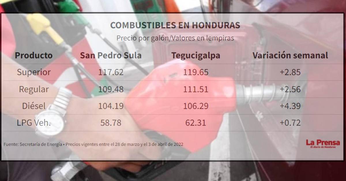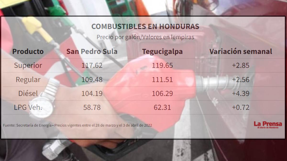 El precio de la gasolina superior rozará este lunes 28 de marzo los 120 lempiras, la regular 112 lempiras y el diésel los 106 lempiras, anunció este sábado la Secretaría de Energía a a través de la Dirección General de Hidrocarburos y Biocombustibles.