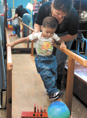 “Mamá, gol”. Óscar Isaac dice esta frase mientras se sostiene con las manos en una andadera para llegar hasta la pelota y chutar. El niño de dos años no puede caminar.