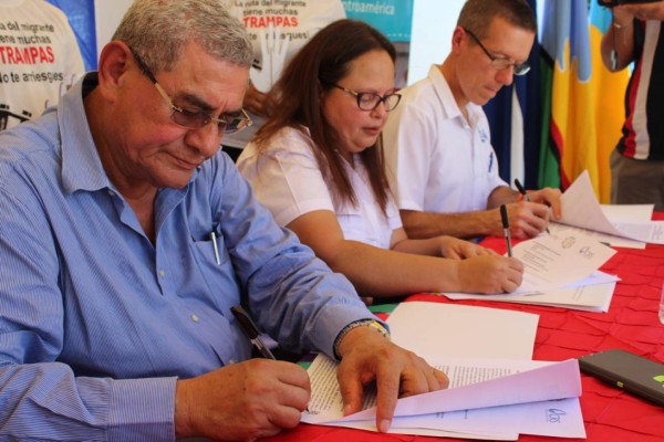 Leopoldo Crivelli, alcalde de Choloma, Patricia López, directora de Glasswing Honduras y Conor Walsh, representante de CRS en Honduras.