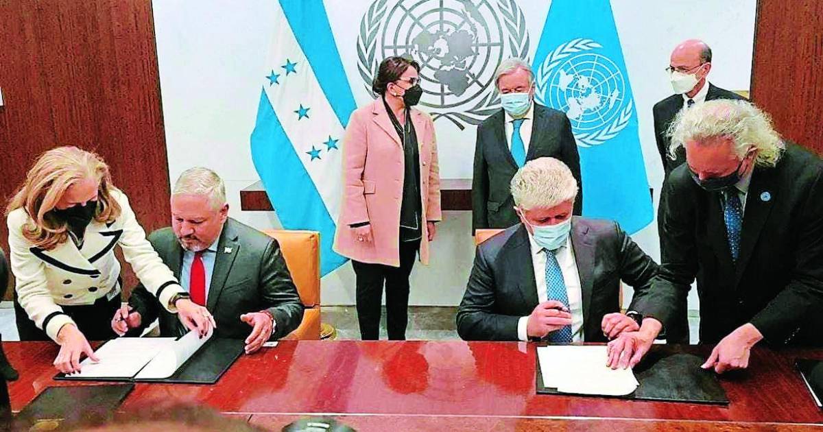 La presidenta Xiomara Castro y el secretario general de la ONU, Antonio Guterres, fueron testigos de honor, ya que la firma del documento se dio por parte del canciller Eduardo Enrique Reina y el enlace de la ONU, Miroslav Jenca.