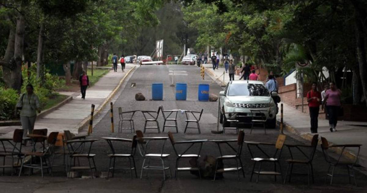 En Tegucigalpa se puede ingresar normal pero hay barreras de pupitres en las entradas a los edificios; en San Pedro Sula es imposible ingresar al campus, pues hay colocada una bandera en el portón que fue cerrado por los estudiantes.