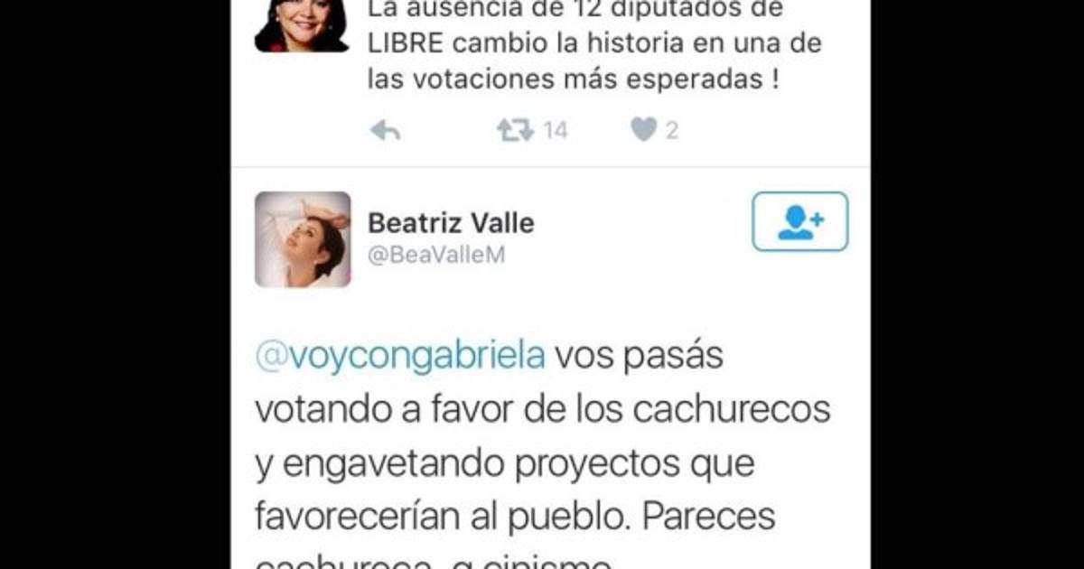 '@voycongabriela por qué mentís? 8 de tu bancada votaron a favor y fuimos 6 los que faltamos. Tenés valor, después de ya haber entregado el CN (Congreso Nacional)', contestó Valle, a través de su cuenta @BeaValleM.