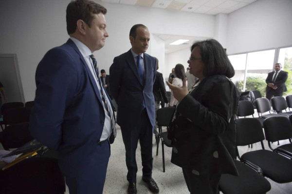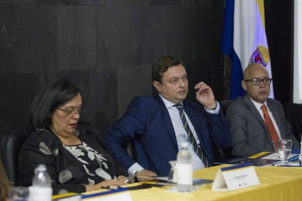 | El jefe de la delegación de Unión Europea en Honduras Ketil Karlsen, la rectora de la (Unah), Julieta Castellanos, el director de la Facultad Latinoamericana Ciencias Sociales Facultad Latinoamericana Ciencias Sociales en Honduras, Rolando Sierra Fonseca, durante el lanzamiento del Observatorio de Migraciones Internacionales en Honduras. EFE