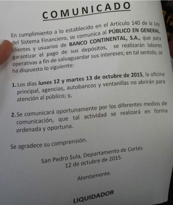 | Liquidadores de Banco Continental informan a los clientes que las agencias bancarias estarán cerradas el lunes y el martes.