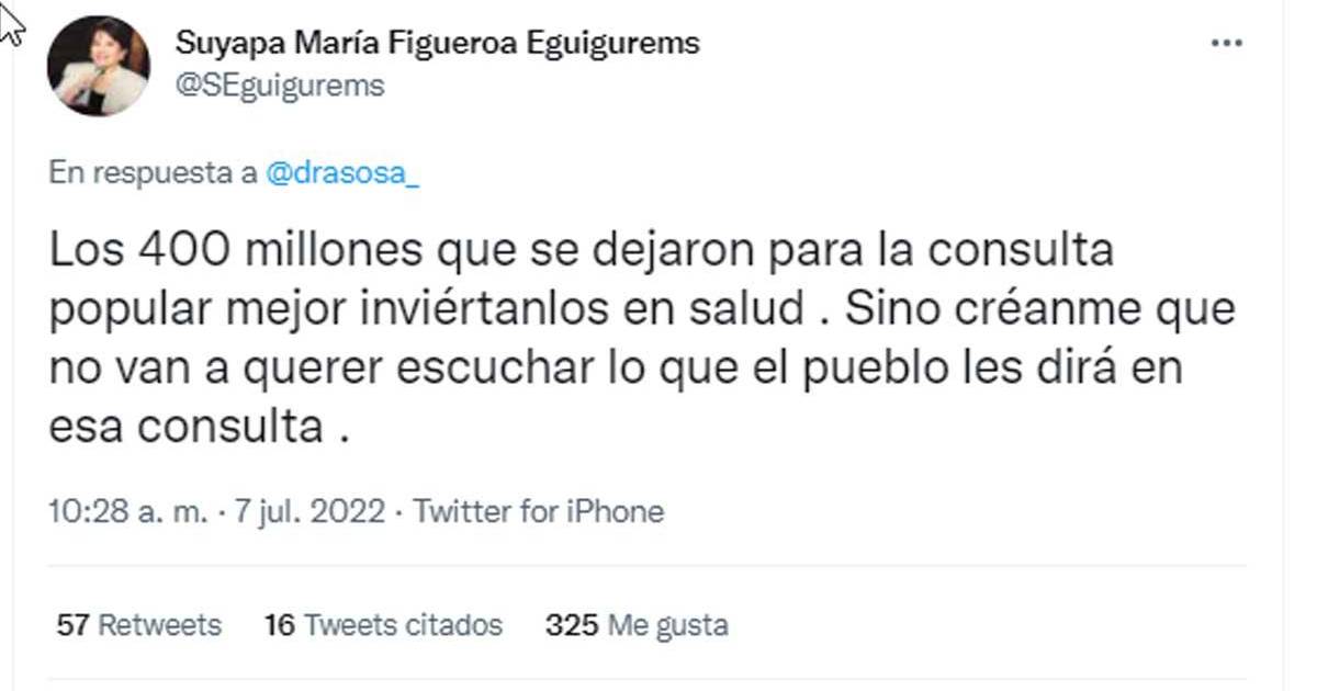 “Los 400 millones que se dejaron para la consulta popular mejor inviértanlos en salud. Sino créanme que no van a querer escuchar lo que el pueblo les dirá en esa consulta”, escribió a través de su cuenta de Twitter la diputada Suyapa Figueroa.