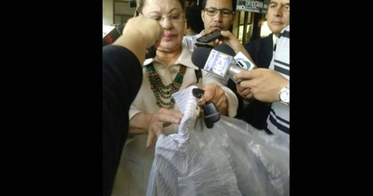 Melva Vásquez llegó con la camisa rota que supuestamente llevaba Pastor cuando fue supuestamente agredido por militares antes de su audiencia inicial en los tribunales de Comayagüela.