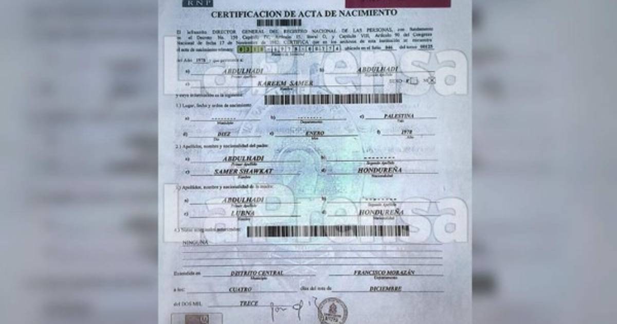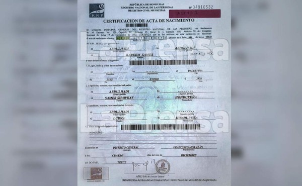 La certificación del acta de nacimiento establece que Kareen Samer Abdulhadi fue inscrito fraudulentamente en el municipio de Siguatepeque, Comayagua, con el número de identidad 0318-1978-00774, siendo sus padres Samer Shawkat y Lubma Abdulhadi, originarios de Palestina.