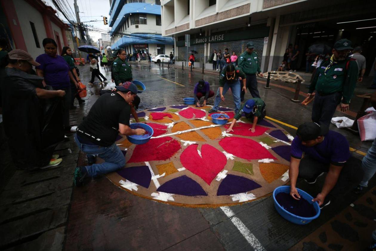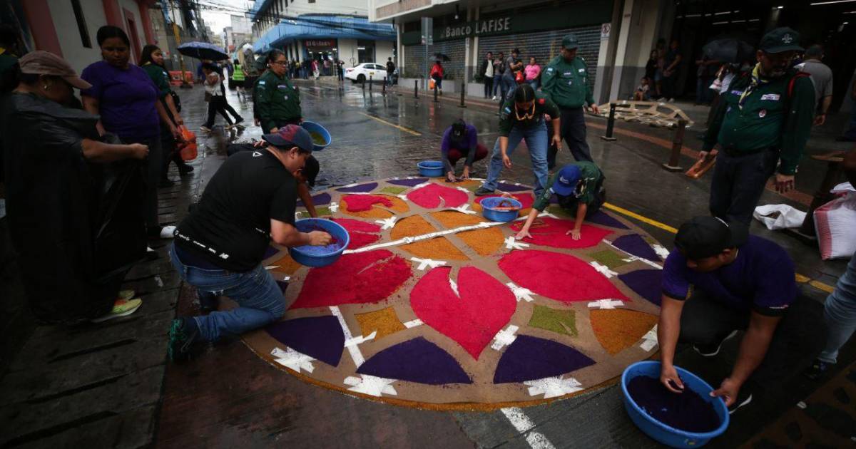 Los sacos de colores y el aroma del aserrín húmedo impregnan el aire del centro, recordando que, más allá de la técnica, lo que se plasma en el pavimento es una profunda manifestación de la espiritualidad hondureña.