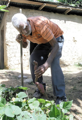 Enseguida se incorpora sostenido por un bastón y se dirige hacia el patio donde tiene un cultivo de camote. En la parcela se agacha para arrancar uno de los tubérculos que ya está morado sin dar muestras de que le molesta ni siquiera el perdigón de plomo que aún tiene incrustado en su espalda.