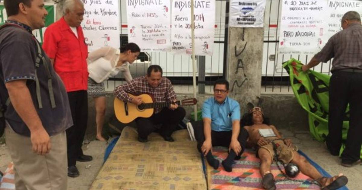 Ocho miembros de Frente Nacional de Resistencia Popular (FNRP) se plantaron frente al Instituto Hondureño de Seguridad Social de San Pedro Sula para hacer una huelga de hambre por un día en apoyo a los huelguistas que están en Tegucigalpa.