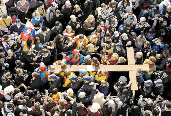 Miles de jóvenes cristianos entonando cánticos y llevando las banderas de varios países del mundo acompañaron la cruz por toda la ciudad, donde cientos de calles estarán cortadas por las celebraciones.