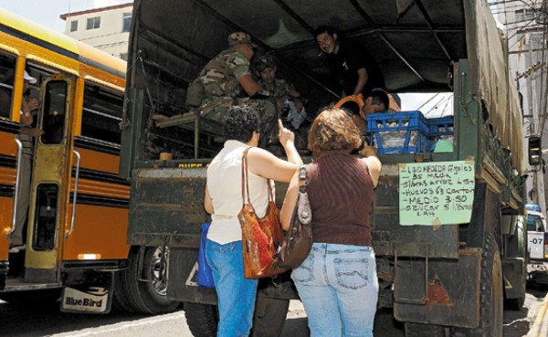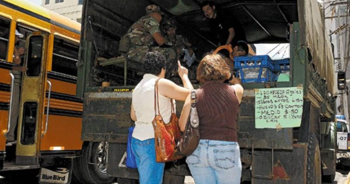 En camiones, efectivos del Ejército hondureño salieron a las calles a vender productos de la canasta familiar, en apoyo a la Suplidora Nacional de Productos Básicos, Banasupro, creada para equilibrar los precios en el país.